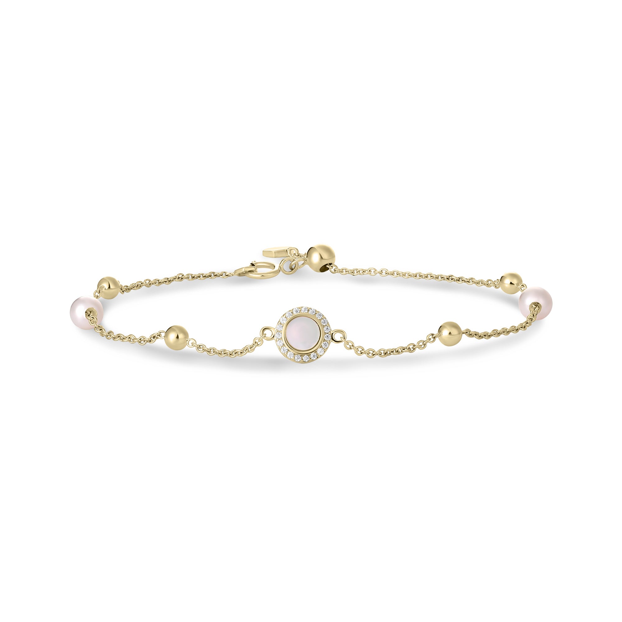Deze prachtige armband van 14-karaats goud combineert de elegantie van parelmoer, parels en gouden kralen voor een werkelijk verfijnd ontwerp. Het middenstuk is voorzien van een prachtige parelmoeren munt, omringd door een delicate rij sprankelende zirkonia's, die een vleugje glans toevoegen. De armband is bezaaid met glanzende parels en stralende gouden kralen, wat zorgt voor een harmonieuze mix van luxe en verfijning. De 14-karaats gouden band verbindt alles met elkaar en zorgt voor een strakke, tijdloze look die perfect is voor zowel dagelijks gebruik als speciale gelegenheden. Deze armband is een prachtig statement piece dat elegantie en charme uitstraalt, elke keer dat u hem draagt.