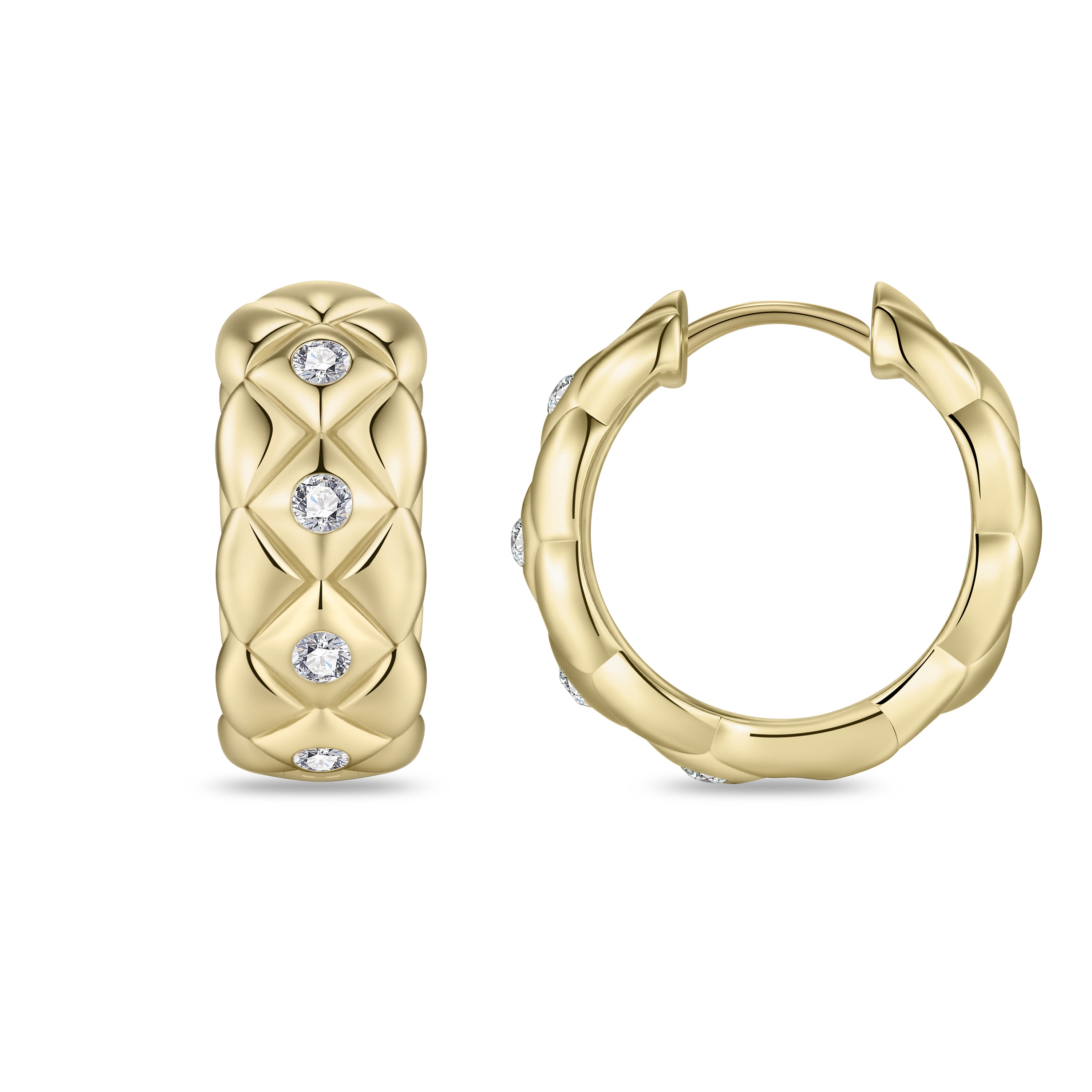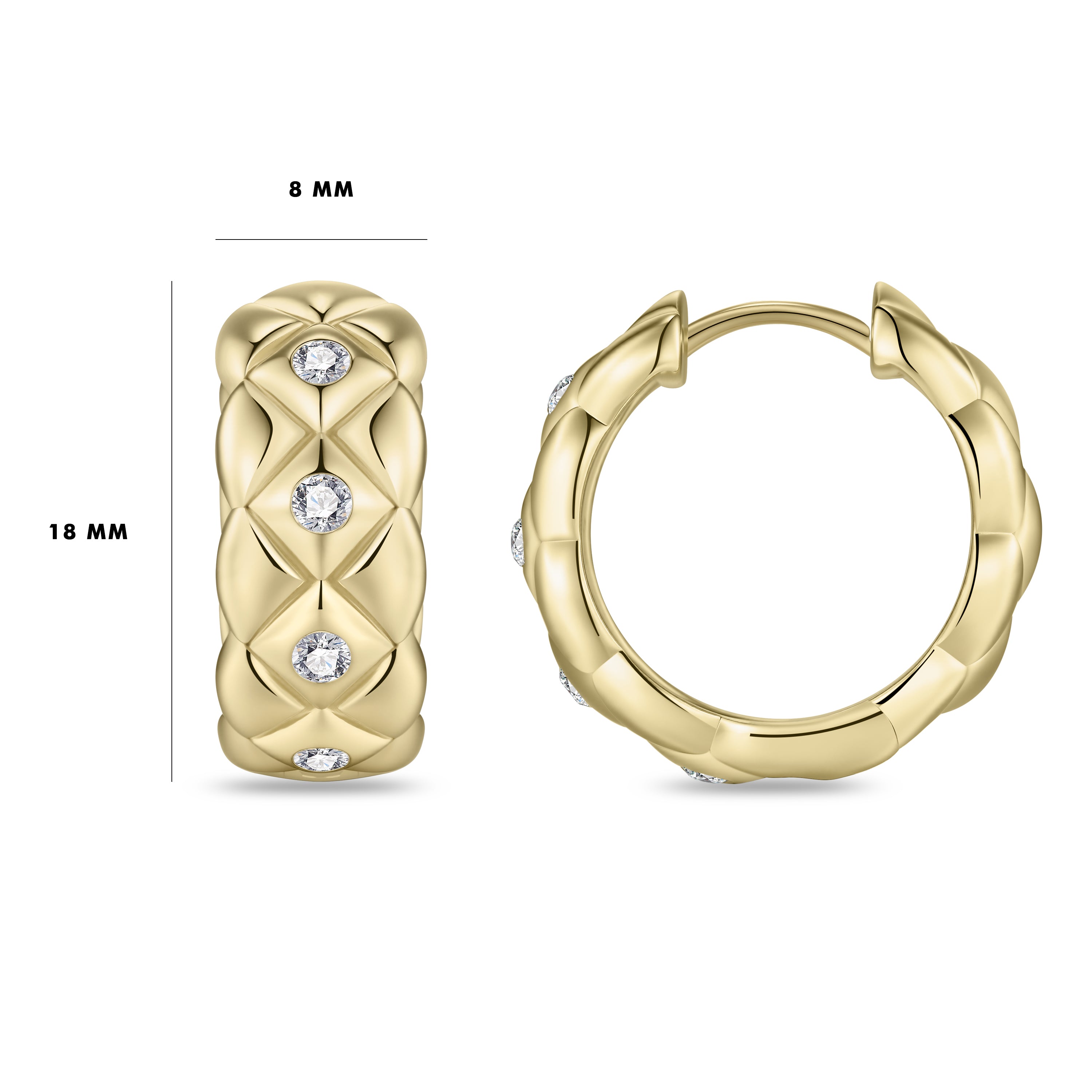 Make a bold yet elegant statement with these medium-sized gold plated sterling silver hoop earrings. Featuring the signature quilted design adorned with sparkling zirconia accents, these hoops bring extra presence and brilliance compared to their smaller counterpart. The larger silhouette enhances the intricate texture and shimmering stones, making them the perfect balance of sophistication and standout style.