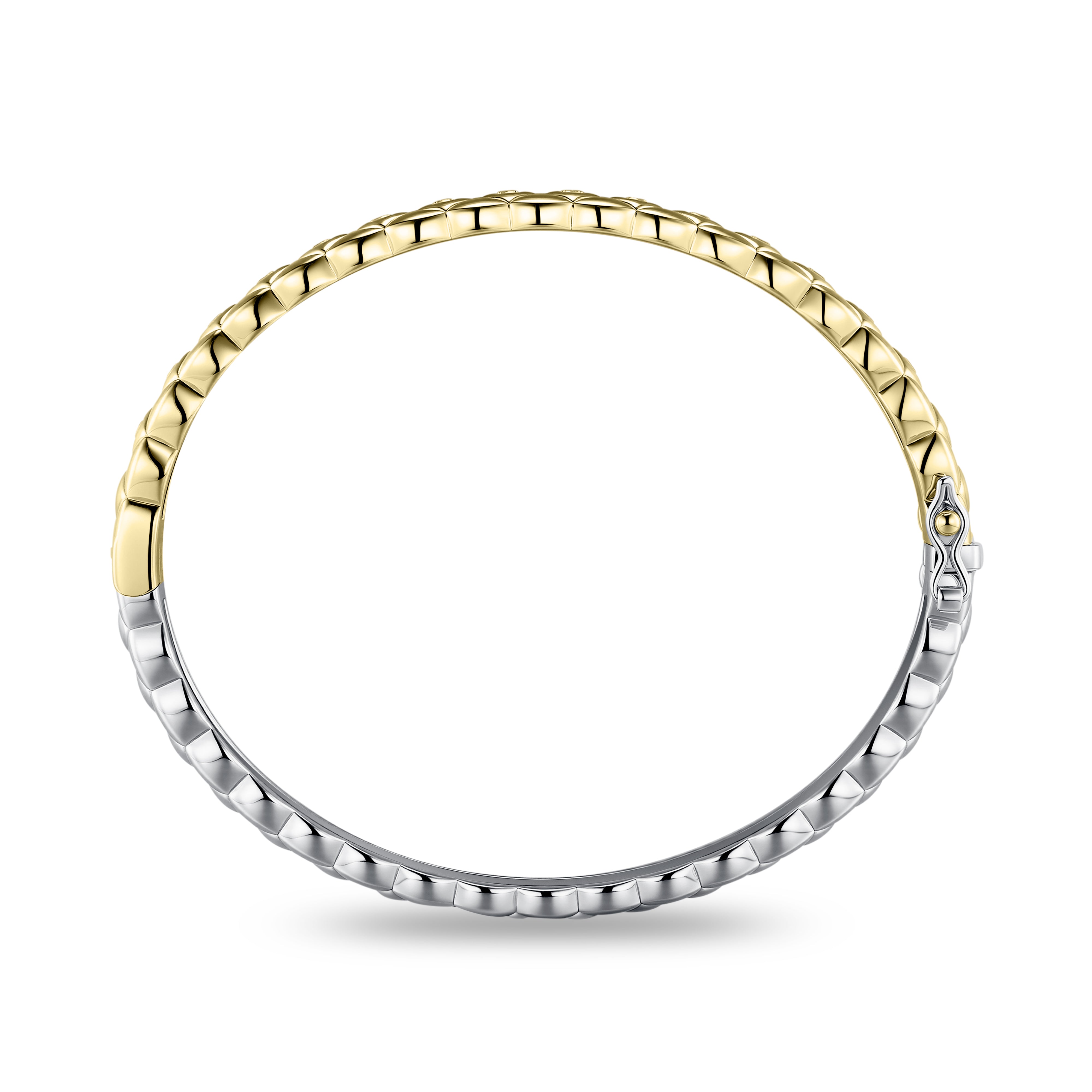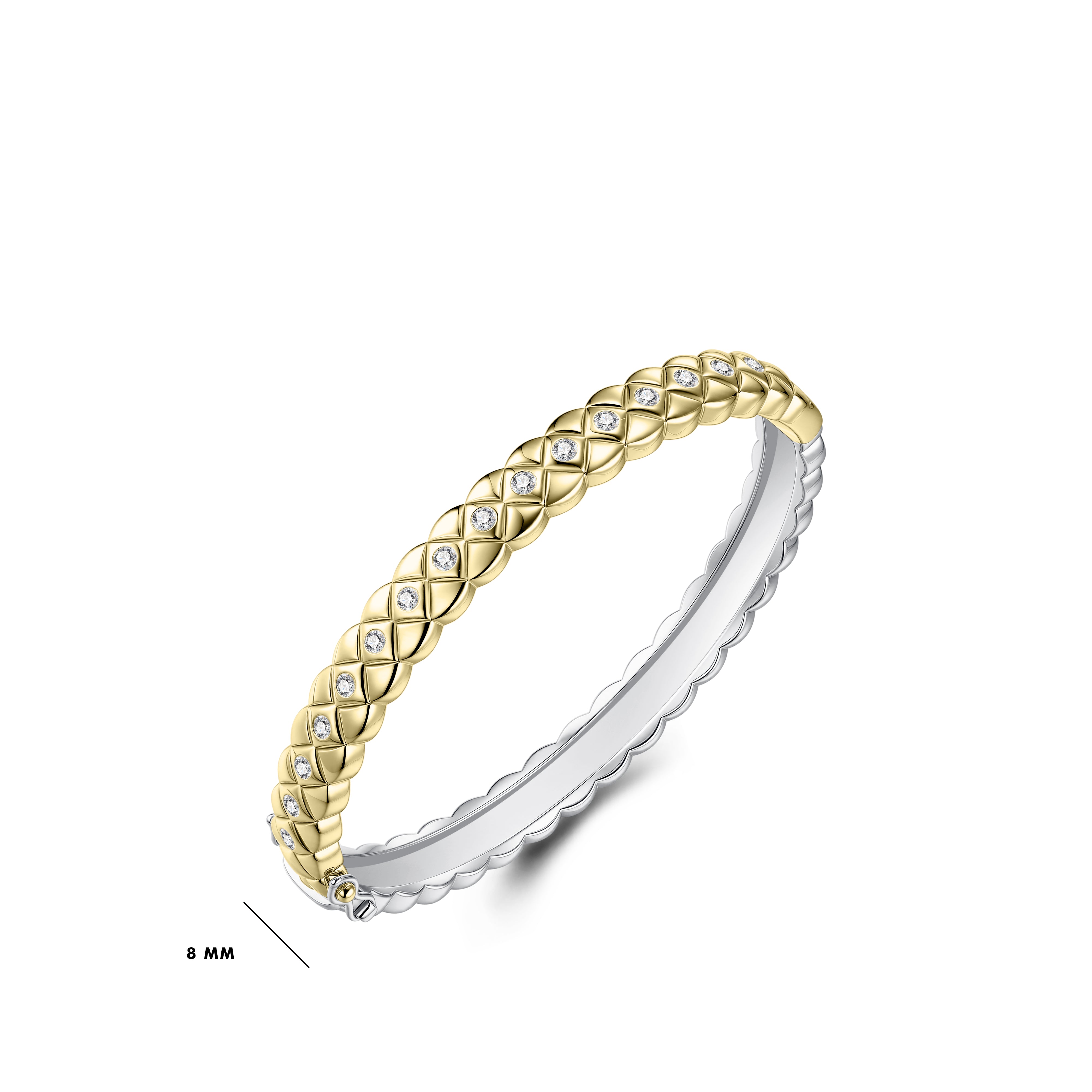 This stunning gold-plated bangle showcases an elegant quilted motif with a sleek, curved design and smooth edges for a comfortable fit. Adorned with sparkling zirconia stones, it catches the light beautifully, adding a touch of luxury to any outfit.