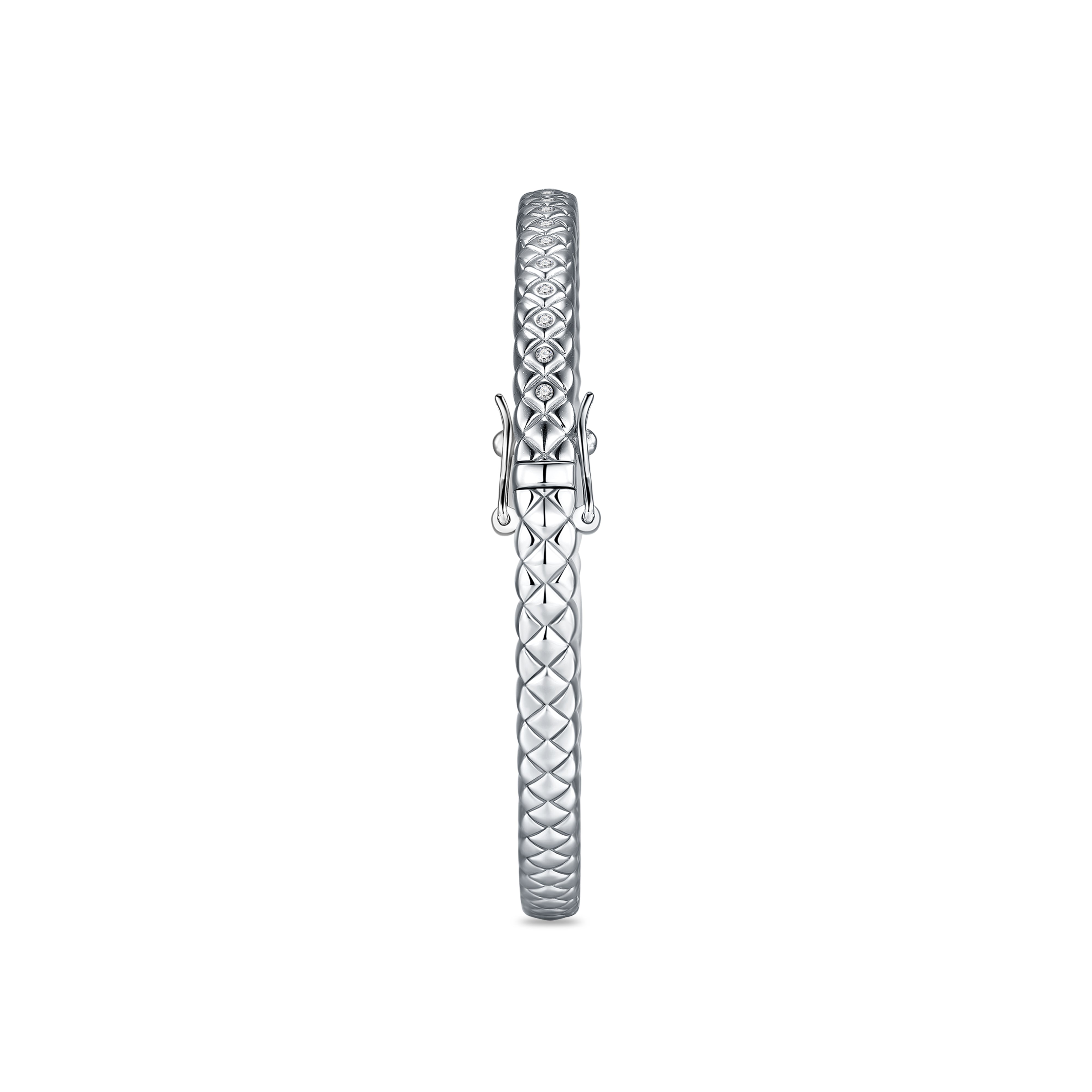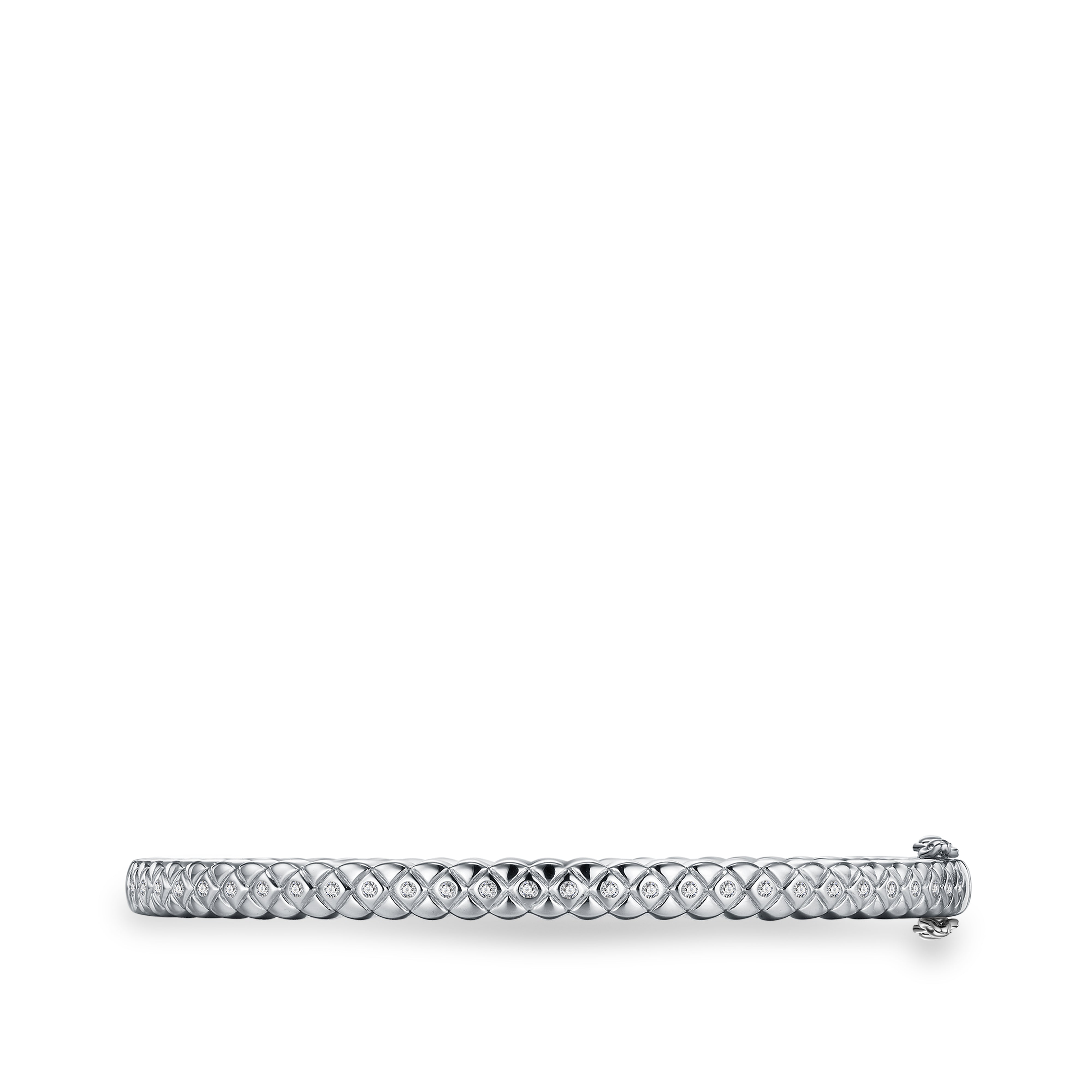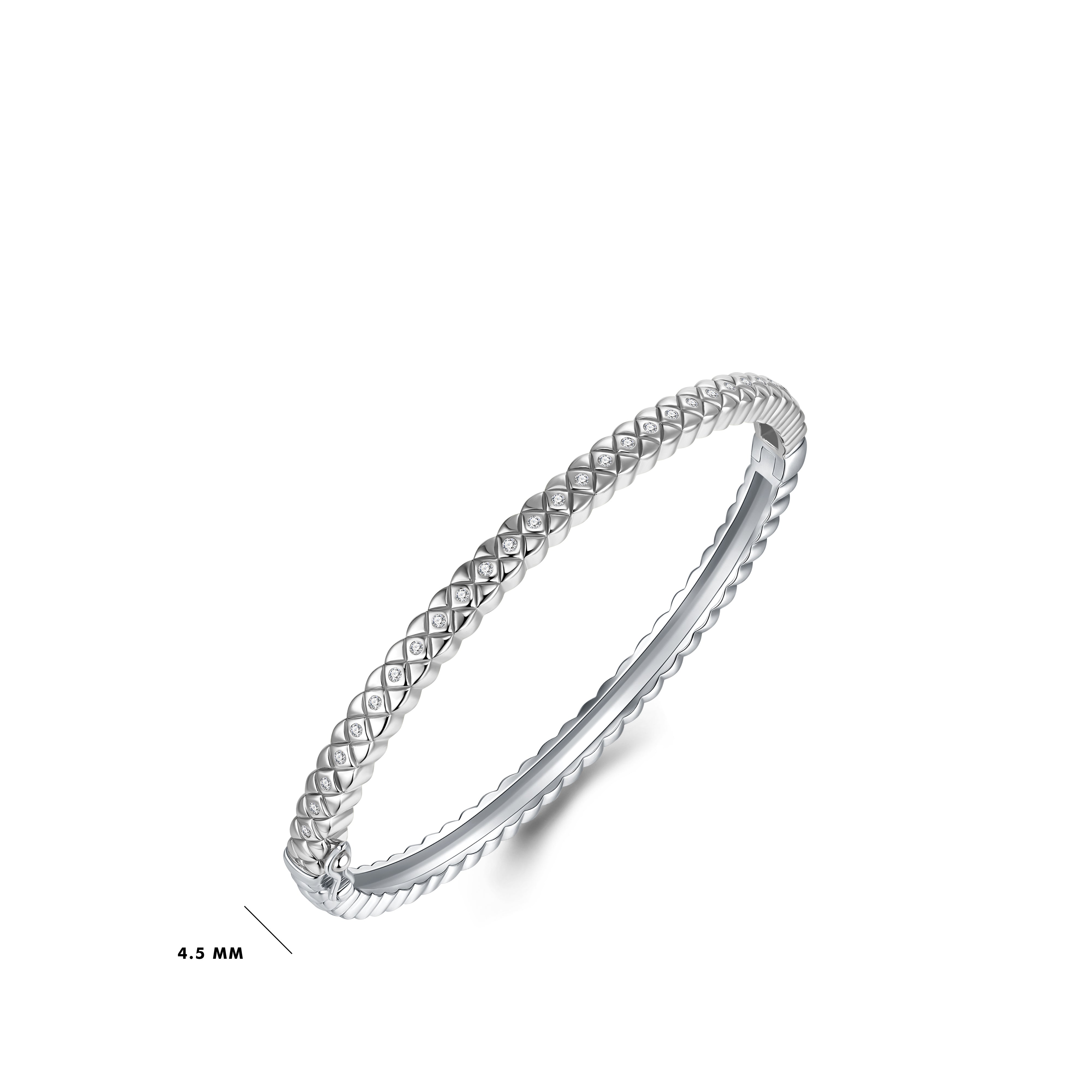 This stunning Silver bangle is a slightly thinner version of the Quilted Bangle and retains the elegant quilted motif along with a curved design and smooth edges for a comfortable fit. Adorned with sparkling zirconia stones, it is perfect for stacking with other bracelets and bangles.
